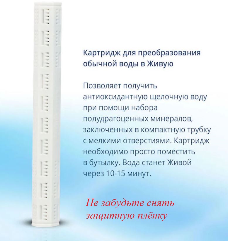 Картридж необходимо просто поместить в бутылку, термос, графин и другие сосуды и уже через 10 минут у Вас чистая целебная вода!