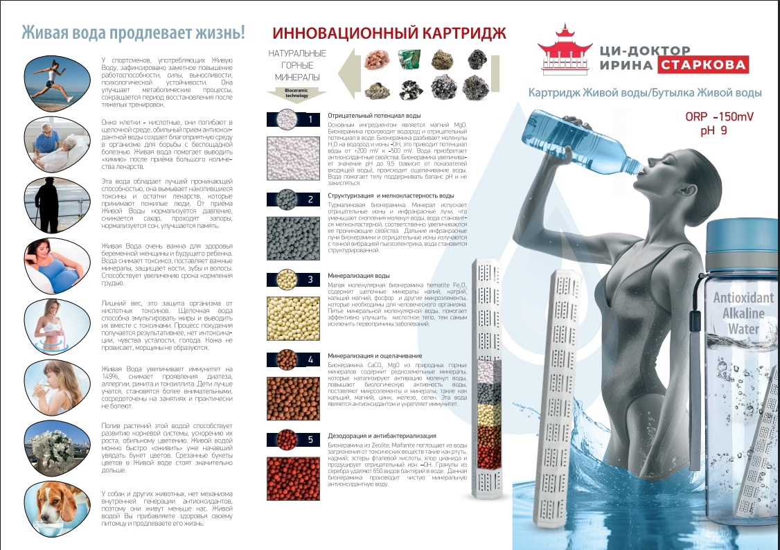 Картридж необходимо просто поместить в бутылку, термос, графин и другие сосуды и уже через 10 минут у Вас чистая целебная вода!